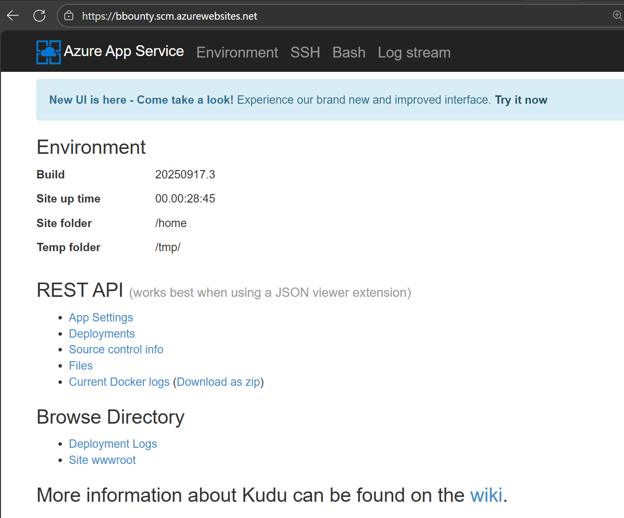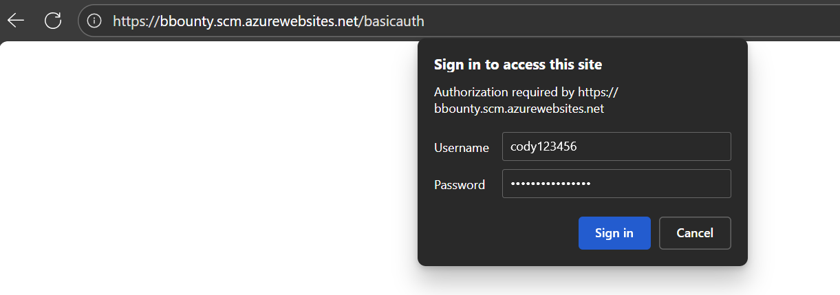 By setting the publishing password in any tenant, you can now take over App Services the user has permissions to modify. Note that there is one restriction: basic auth publishing credentials need to be enabled on the App Service for SCM. There are several ways to do this, but the simplest would be to login to the App Service Kudu console with the new credentials: