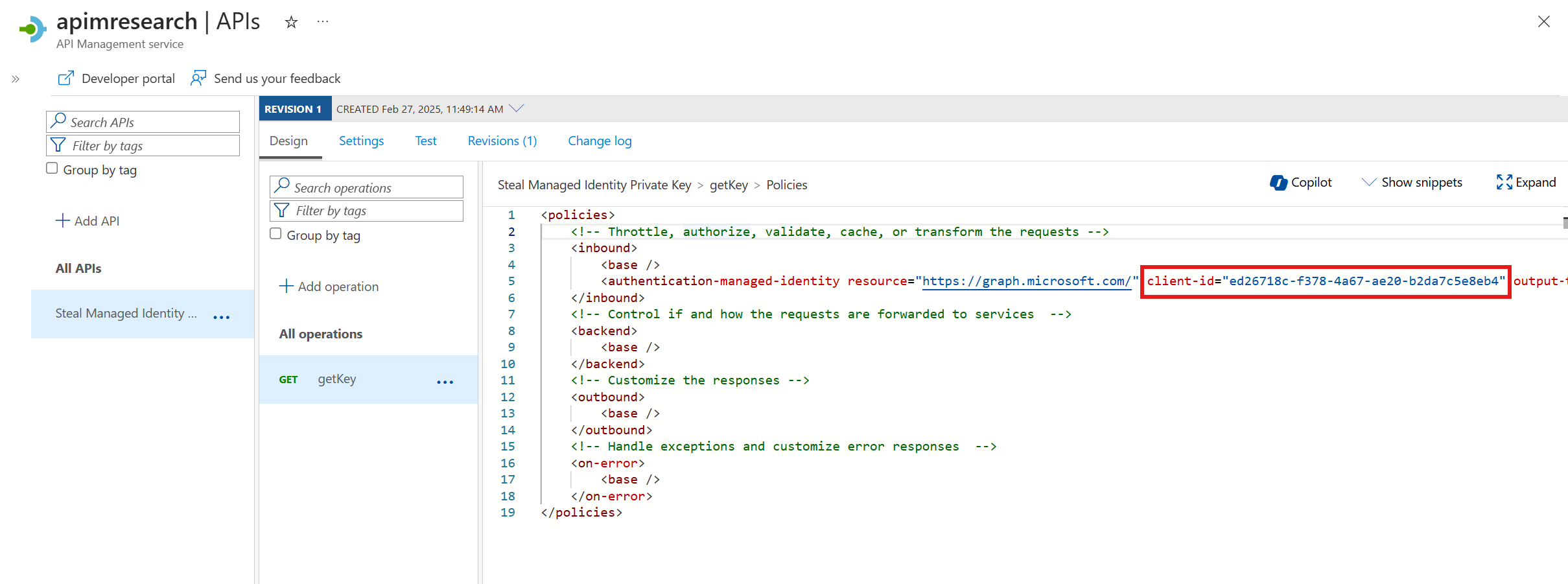 The second step is to ensure there is a policy configured in APIM that uses a managed identity for an API that is accessible on this self-hosted gateway: