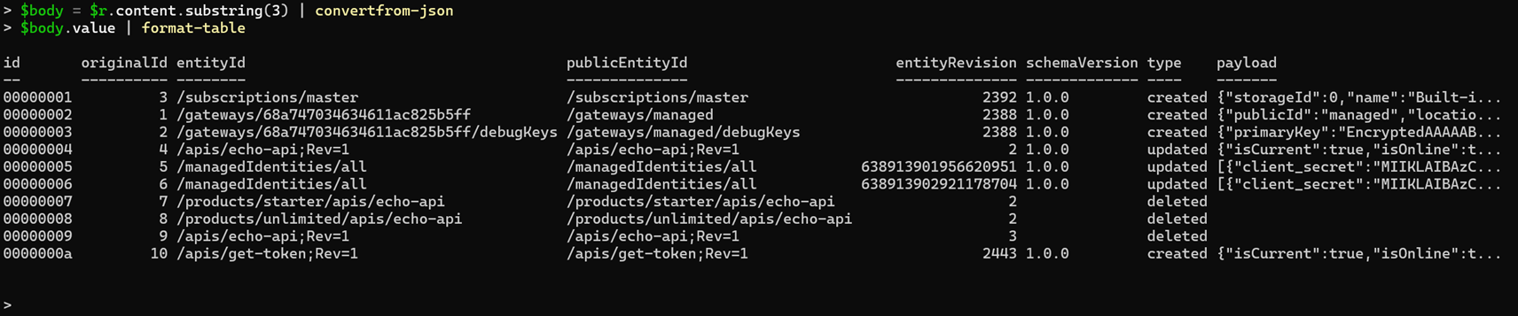 If we parse the payloads from the "events" API above and look into events with the /managedIdentities/all entityId, we find the following: