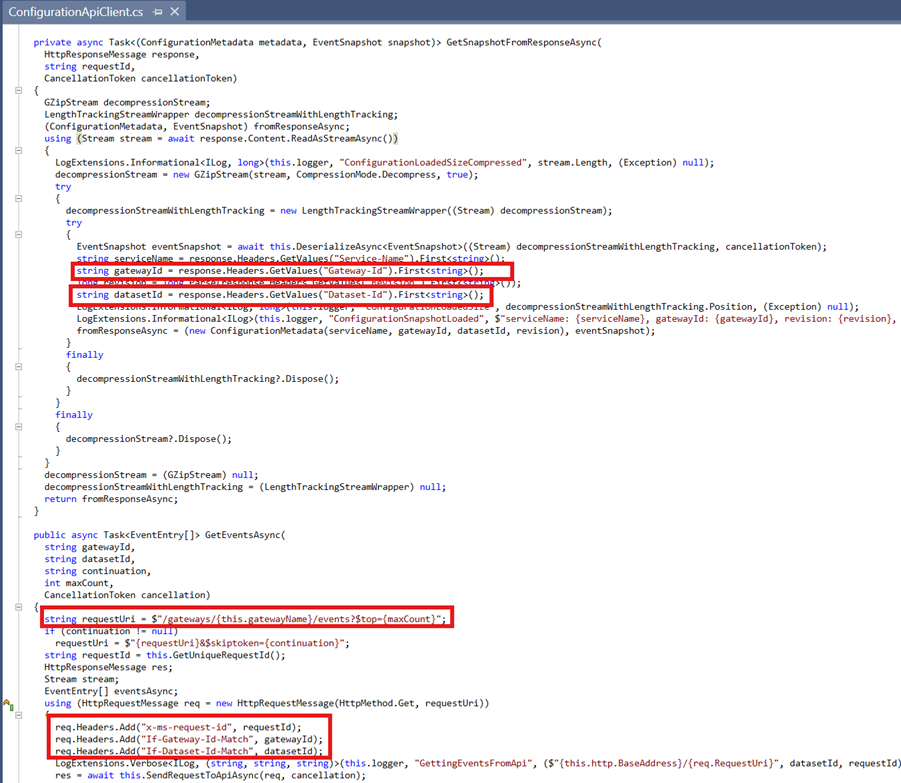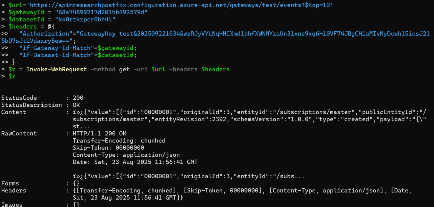 - The undocumented configuration API in APIM has an endpoint called /events which gets polled by the self-hosted gateway to collect configurations. These configurations contain data such as the plaintext policies and the APIs that should be recognized by the gateway.