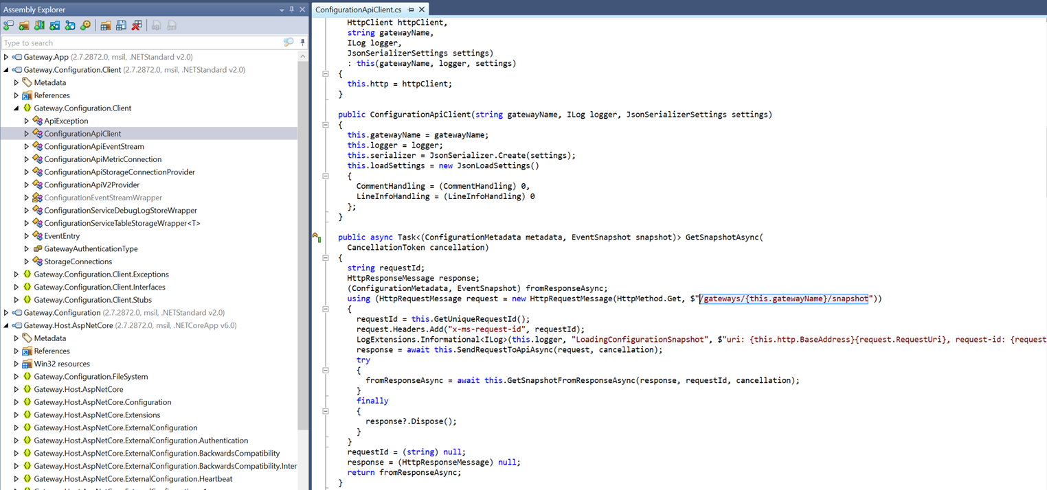 Instead of fussing with the proxy settings or setting up an invisible proxy, the dotnet source could be collected from the docker container, decompiled in dotpeek, and reverse engineered manually. This method proved to be simple and quickly led to some interesting endpoints:
