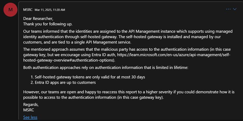 - Managed Identity certificates are returned in plaintext when the self-hosted gateway polls the /events API. We will next explain why this is an issue in the next section.